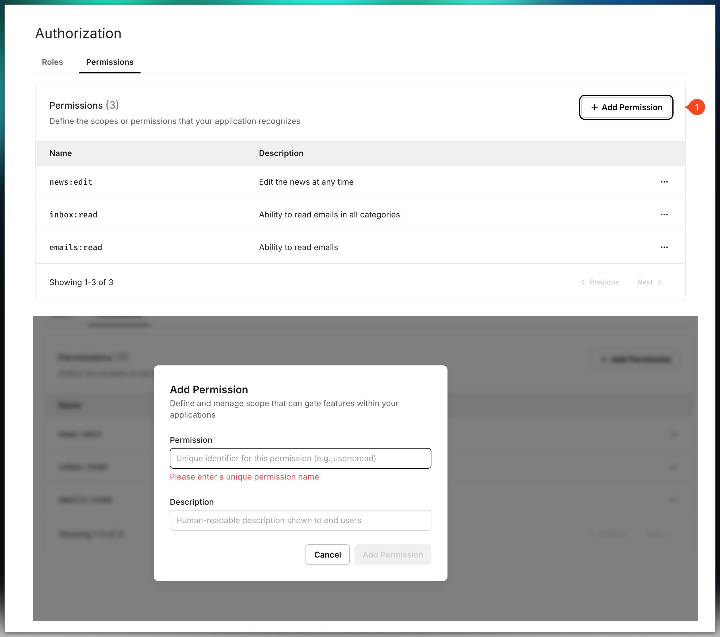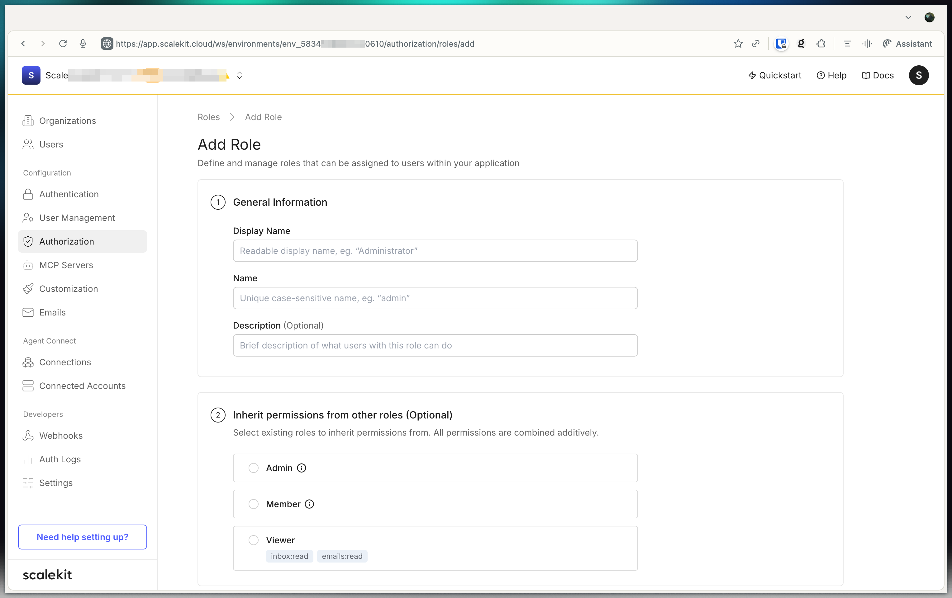 Section titled “Manage roles and permissions”You can register roles and permissions from the Scalekit dashboard: