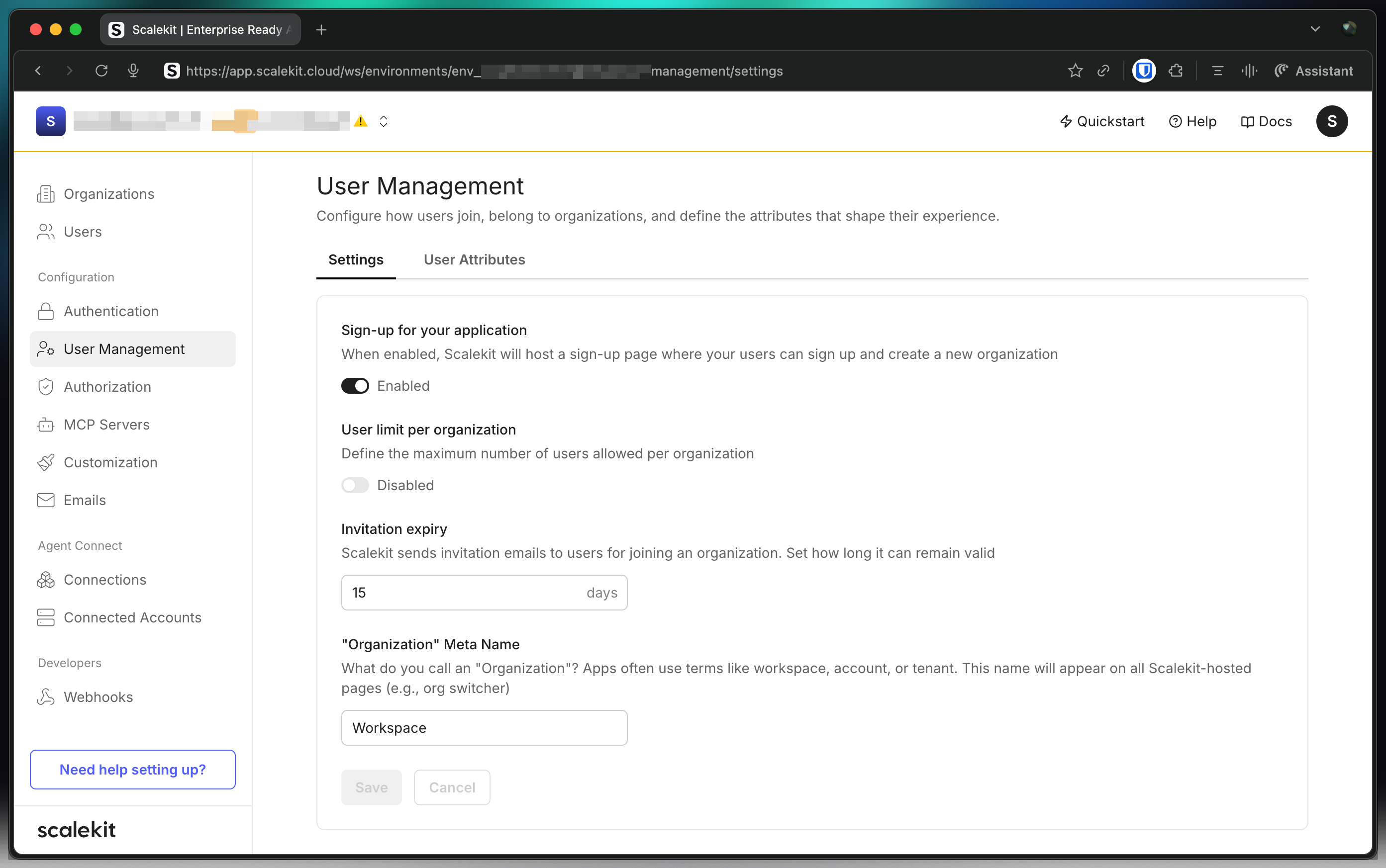 User management settings allow you to configure how user data is handled in the environment and what attributes are available for users in your application. These settings are accessible from the User Management section in the Scalekit dashboard.