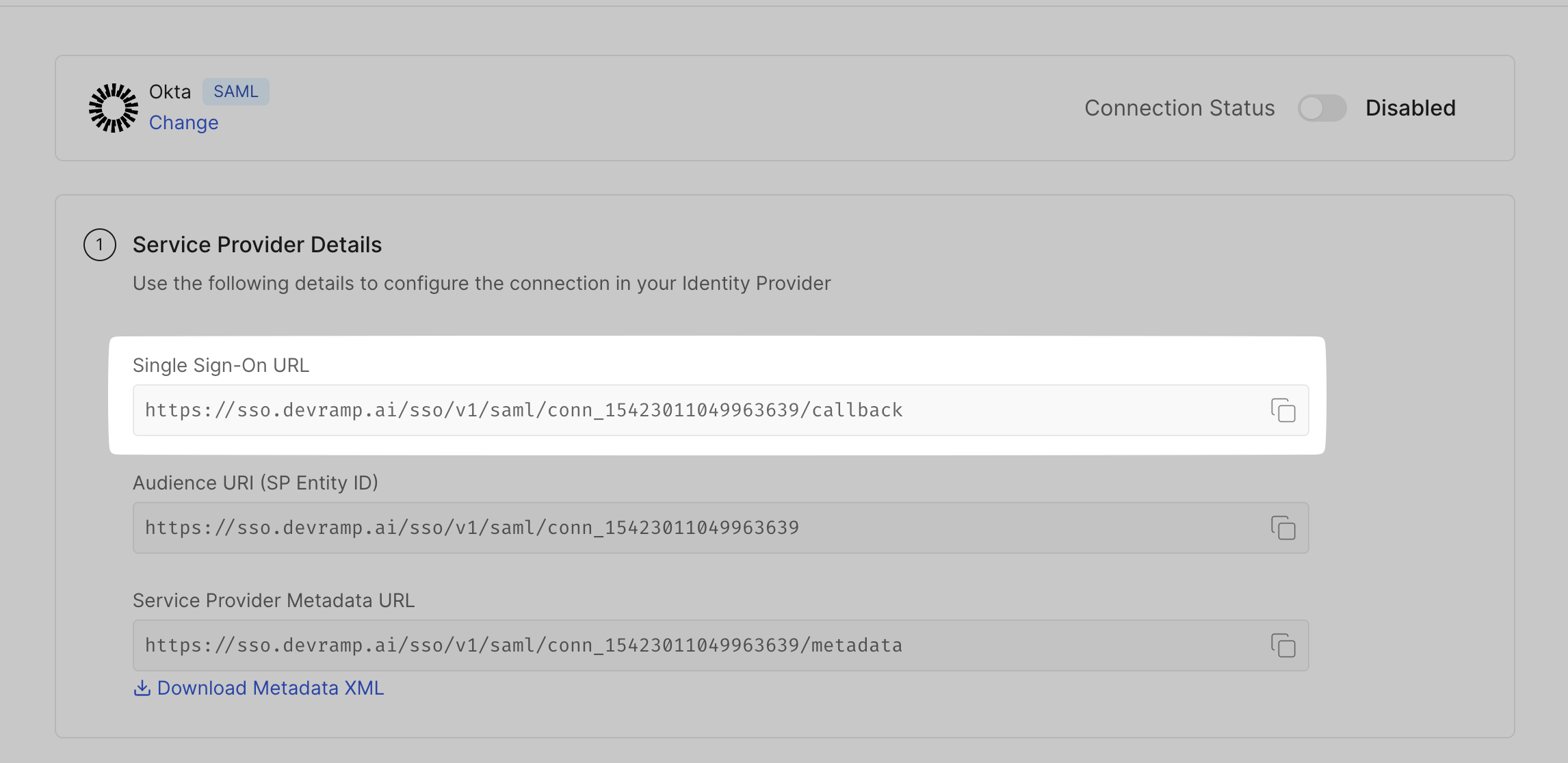Section titled “Enable Connection”Click on Enable Connection. This will let all your selected users login to the new application via your Okta SSO.