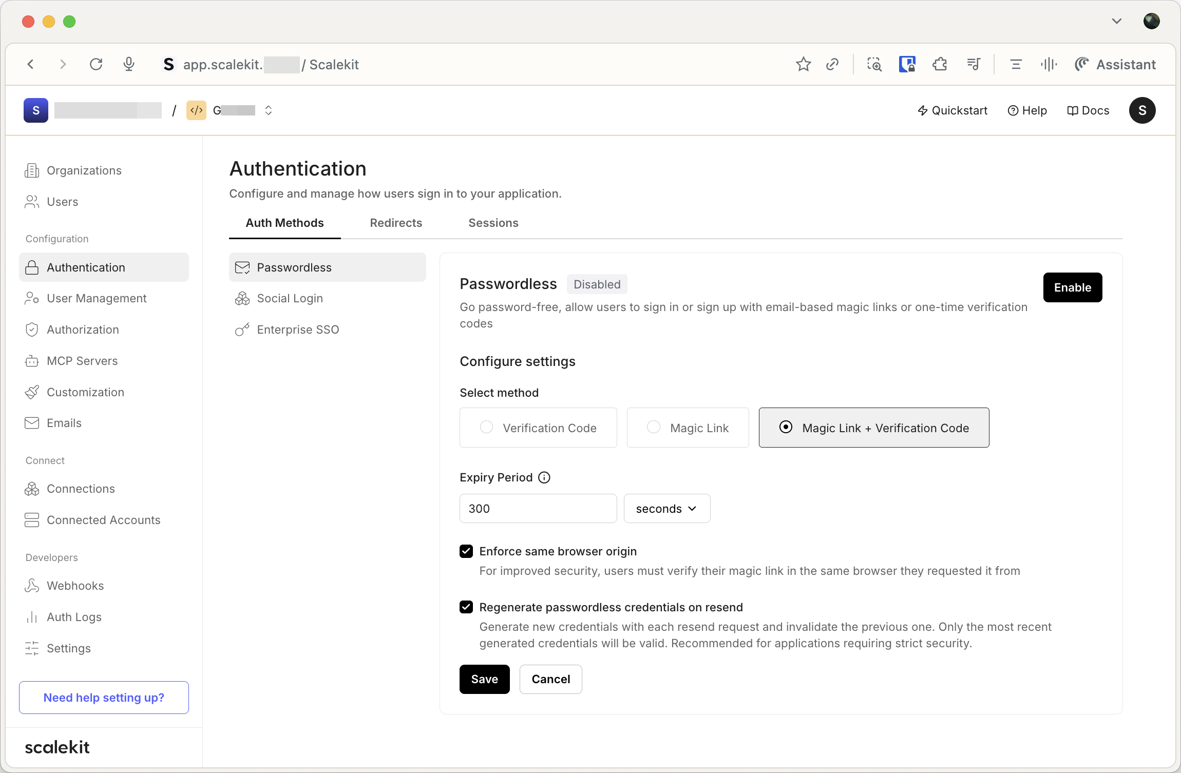 Before implementing the code, ensure passwordless authentication is properly configured in your Scalekit dashboard.